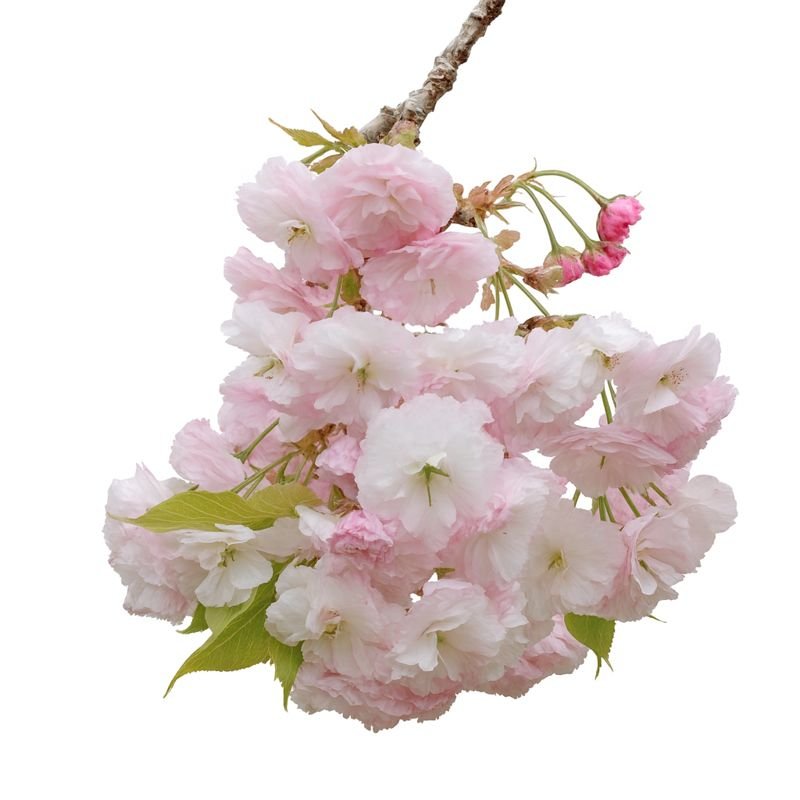 Botánica: Prunus serrulata ‘Shogetsu’ (Sakura Shogetsu / “Blushing Bride”). Cerezo japonés de flor doble blanca, racimos colgantes y gran valor ornamental.